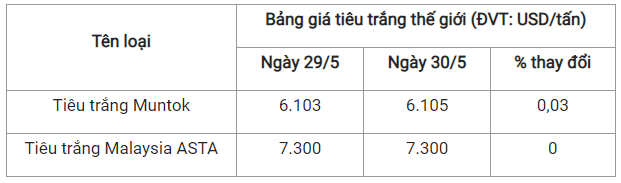 Theo cập nhật từ Hiệp hội Hồ tiêu Quốc tế (IPC) ngày 30/5 (theo giờ địa phương), giá tiêu thế giới so với ngày 29/5 như sau: