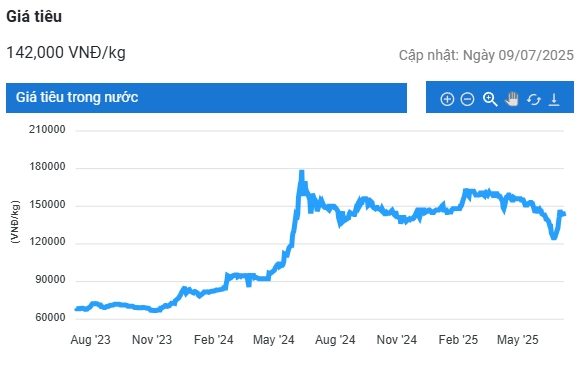 Giá tiêu hôm nay (8/7) dao 140.000 – 142.000 đồng/kg, giảm nhẹ 1.000 – 2.000 đồng/kg ở một vài tỉnh thành. Trên thị trường thế giới, giá tiêu Indonesia tăng nhẹ trở lại, trong khi các quốc gia khác nhìn chung không đổi.