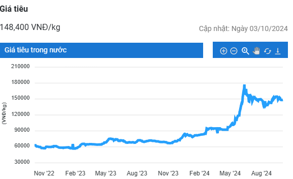 Trong khi đó, giá tiêu tại tỉnh Đồng Nai và tỉnh Bà Rịa - Vũng Tàu đi ngang ở mức 148.000 đồng/kg.