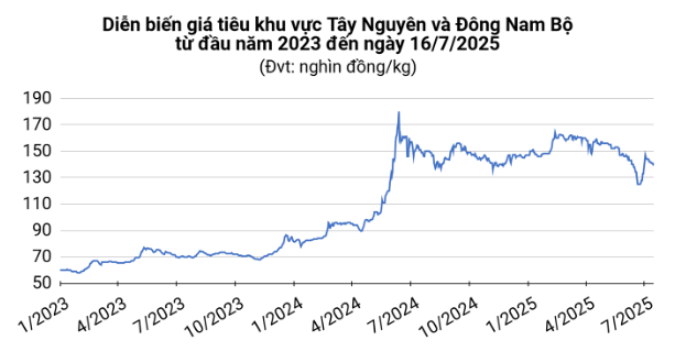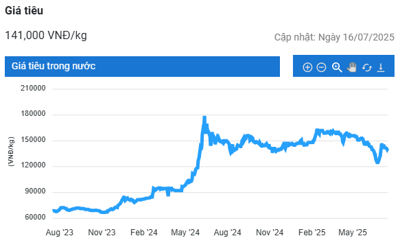Giá tiêu hôm nay (16/7) tại thị trường trong nước đồng loạt tăng trở lại 1.000 đồng/kg, dao động trong khoảng 139.000 – 141.000 đồng/kg. Từ con số gần 500 ha, đến cuối năm 2025 diện tích hồ tiêu toàn tỉnh An Giang chỉ còn khoảng 390 ha, giảm gần 100 ha so với 3 năm trước.
