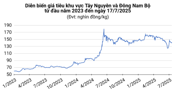 Giá tiêu hôm nay (17/7) tại thị trường trong nước dao động trong khoảng 138.000 – 140.000 đồng/kg, giảm nhẹ 1.000 đồng/kg tại Đắk Lắk và Gia Lai. Trên thị trường thế giới, giá tiêu Brazil và Indonesia vẫn trong xu hướng giảm.