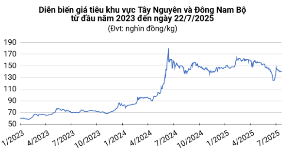 Giá tiêu hôm nay (22/7) tại thị trường trong nước tiếp tục giữ ổn định trong khoảng 137.000 – 140.000 đồng/kg. Trên thị trường thế giới, giá tiêu Indonesia điều chỉnh giảm nhẹ. Còn tại Ấn Độ, mưa lớn trong những ngày qua đã ảnh hưởng đến tiêu thụ ở miền Bắc nước này.