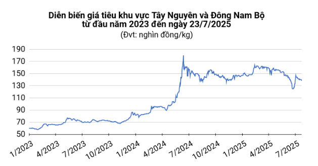 Ngược chiều thế giới, giá tiêu hôm nay (23/7) tại thị trường trong nước giảm 500 – 2.000 đồng/kg. Theo Cục Xuất nhập khẩu, dù nguồn cung đang thấp, nhưng sức mua yếu khiến đà tăng giá của hạt tiêu chưa thể bứt phá.