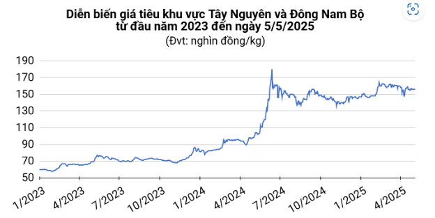 Trong tháng 4 vừa qua, giá tiêu nội địa giảm khoảng 4.000 – 5.000 đồng/kg do tác động từ các chính sách thuế quan của Mỹ. Tuy nhiên, mức giá hiện tại vẫn cao hơn từ 57 - 59% (56.500 – 58.000 đồng/kg) so với cùng kỳ năm ngoái.
