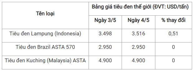 Theo cập nhật từ Hiệp hội Hồ tiêu Quốc tế (IPC) ngày 4/5 (theo giờ địa phương), giá tiêu thế giới so với ngày 3/5 như sau: