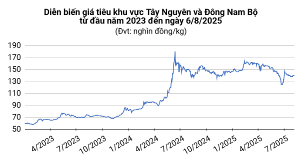 Tại Đắk Nông, giá tiêu vẫn ổn định ở mức 140.000 đồng/kg. Tại các địa phương khác như Gia Lai, Bà Rịa – Vũng Tàu, Đồng Nai và Bình Phước, giá phổ biến trong khoảng 139.000 đồng/kg, không thay đổi so với ngày hôm trước.