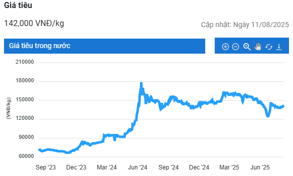 Giá tiêu hôm nay dao động trong khoảng 140.000 – 142.000 đồng/kg, ổn định so với ngày hôm trước. Với mức thuế lên đến 50% vào Mỹ, Ấn Độ có thể sẽ hoàn toàn bị loại khỏi thị trường xuất khẩu tiêu đen và tiêu trắng vì các nước như Việt Nam, Sri Lanka và Indonesia bị áp mức thuế thấp hơn.