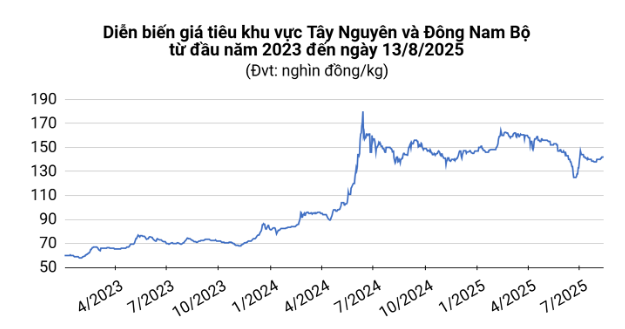 Cụ thể, tại Đắk Lắk và Đắk Nông, giá tiêu đang phổ biến ở mức 142.000 đồng/kg. Các địa phương khác như Gia Lai, Bà Rịa – Vũng Tàu, Đồng Nai và Bình Phước đồng loạt được thu mua ở mức 140.000 đồng/kg.