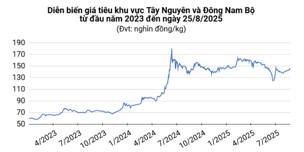 Dù Mỹ đã chính thức áp thuế quan 20% đối với hàng hóa Việt Nam, giá tiêu trong nước vẫn ghi nhận đà phục hồi và duy trì ở mức cao. Ngày 25/8, giá tiêu nội địa dao động trong khoảng 143.500 – 146.000 đồng/kg, tăng 6.000 – 8.000 đồng/kg kể từ đầu tháng 8 đến nay.