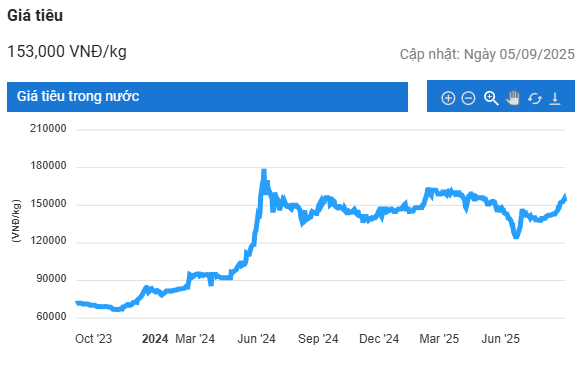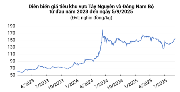 Giá tiêu tại khu vực Đông Nam Bộ phổ biến ở mức 152.000 đồng/kg. Trong đó, Bà Rịa – Vũng Tàu và Đồng Nai giảm 2.000 đồng/kg, trong khi Bình Phước giảm 1.000 đồng/kg.