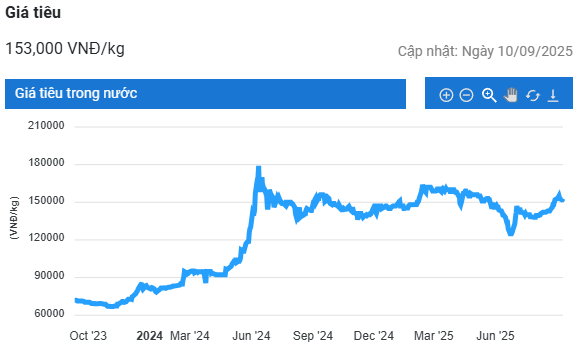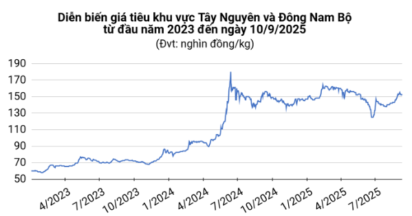 Giá tiêu hôm nay tại thị trường trong nước dao động trong khoảng 150.000 – 153.000 đồng/kg, tăng 1.000 đồng/kg ở một số địa phương. Tháng 8/2025, nhập khẩu tiêu của Việt Nam từ Brazil tăng trở lại, trong khi nhập khẩu từ Mỹ chậm lại do thuế quan đối ứng.