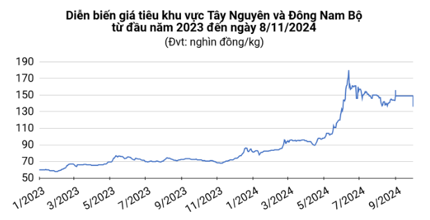 Giá tiêu hôm nay (8/11) đảo chiều tăng 2.500 – 3.000 đồng/kg, dao động trong khoảng 138.000 – 139.000 đồng/kg. Theo số liệu của VPSA, lượng tiêu nhập khẩu của Việt Nam trong tháng 10 tăng gần gấp đôi tháng trước.