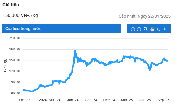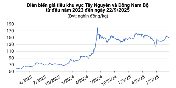 Trong đó, giá tiêu tại Đắk Lắk và Đắk Nông đứng ở mức cao nhất là 150.000 đồng/kg; tiếp đến là Bà Rịa – Vũng Tàu và Đồng Nai đạt 149.000 đồng/kg; trong khi Gia Lai và Bình Phước thấp nhất với 147.000 đồng/kg.