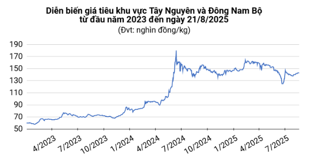 Giá tiêu hôm nay tại thị trường trong nước vẫn không đổi ở mức 140.000 – 143.000 đồng/kg. Trong nửa đầu năm 2025, xuất khẩu hạt tiêu của Campuchia đạt gần 20 triệu USD, giảm 21,37% so với con số 25 triệu USD của cùng kỳ năm 2024.