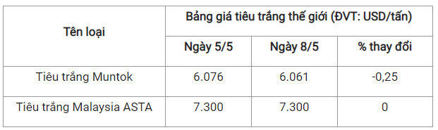 Theo cập nhật từ Hiệp hội Hồ tiêu Quốc tế (IPC) ngày 8/5 (theo giờ địa phương), giá tiêu thế giới so với ngày 5/5 như sau: