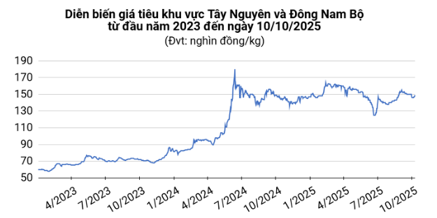 Trong khi đó, giá tiêu tại các địa phương khác giữ ổn định, với Đắk Nông và Đắk Lắk cùng ở mức 148.000 đồng/kg, còn Gia Lai duy trì 146.000 đồng/kg.