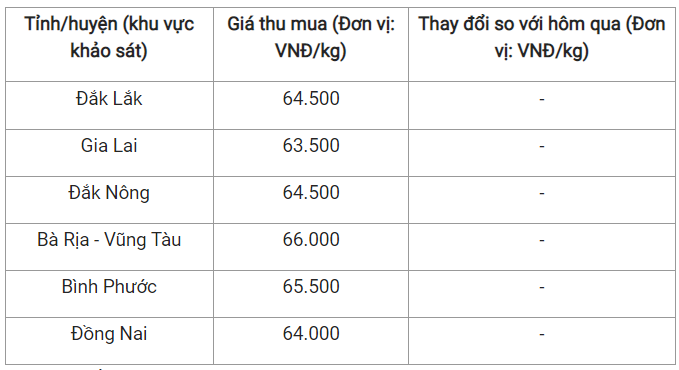 Ghi nhận cho thấy, mức giá thấp nhất là 63.500 đồng/kg tại tỉnh Gia Lai. Kế đến là Đồng Nai với mức 64.000 đồng/kg.