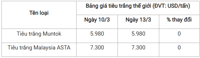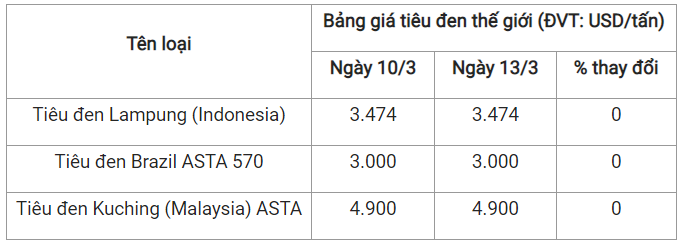 Theo cập nhật từ Hiệp hội Hồ tiêu Quốc tế (IPC) ngày 13/3 (theo giờ địa phương), giá tiêu thế giới so với ngày 10/3 như sau: