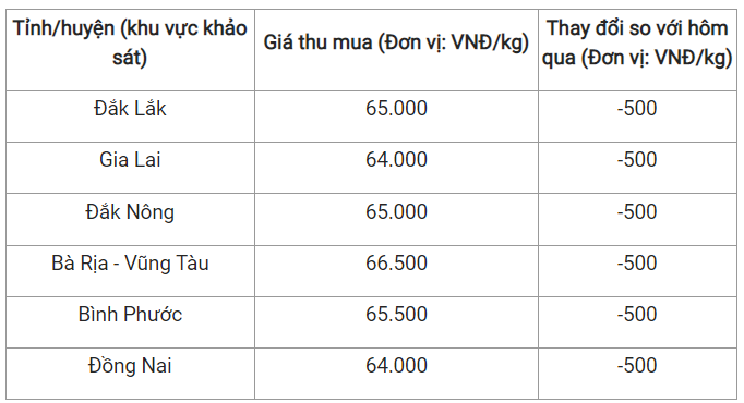 Hiện tại, mức giá thấp nhất là 64.000 đồng/kg được ghi nhận tại hai tỉnh Gia Lai và Đồng Nai.