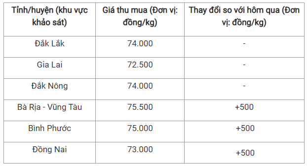 Ghi nhận cho thấy, Gia Lai vẫn là địa phương có giá thu mua thấp nhất với 72.500 đồng/kg. Kế đến là Đồng Nai với mức giá 73.000 đồng/kg - tăng 500 đồng/kg so với hôm qua.