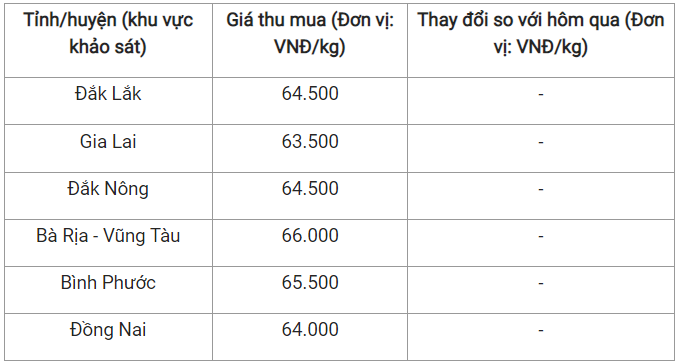 Ghi nhận cho thấy, hai tỉnh Gia Lai và Đồng Nai lần lượt ghi nhận mức giá là 63.500 đồng/kg và 64.000 đồng/kg.