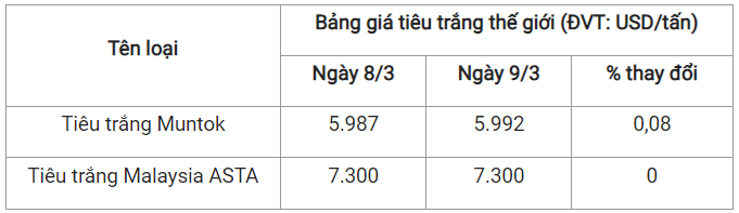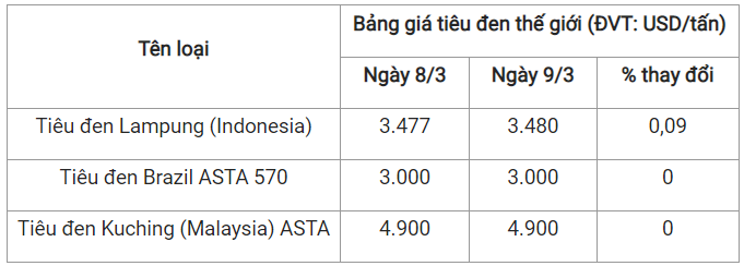 Theo cập nhật từ Hiệp hội Hồ tiêu Quốc tế (IPC) ngày 9/3 (theo giờ địa phương), giá tiêu thế giới so với ngày 8/3 như sau:
