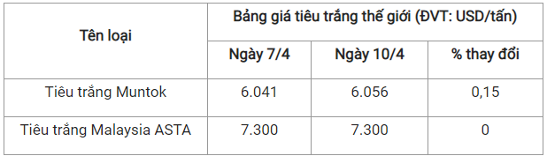Theo cập nhật từ Hiệp hội Hồ tiêu Quốc tế (IPC) ngày 10/4 (theo giờ địa phương), giá tiêu thế giới so với ngày 7/4 như sau: