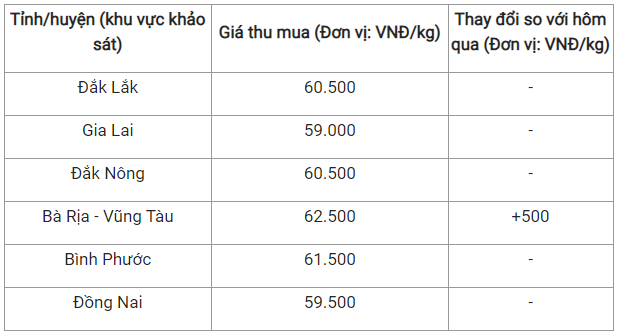Trong đó, hai tỉnh Gia Lai và Đồng Nai lần lượt ghi nhận mức giá là 59.000 đồng/kg và 59.500 đồng/kg.