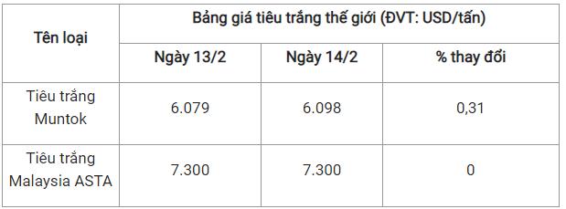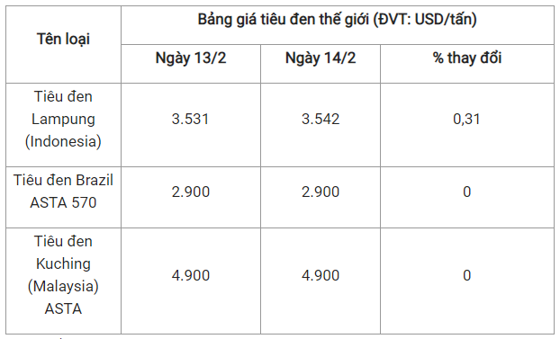 Theo cập nhật từ Hiệp hội Hồ tiêu Quốc tế (IPC) ngày 14/2 (theo giờ địa phương), giá tiêu thế giới so với ngày 13/2 như sau: