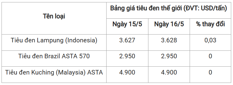 Theo cập nhật từ Hiệp hội Hồ tiêu Quốc tế (IPC) ngày 16/5 (theo giờ địa phương), giá tiêu thế giới so với ngày 15/5 như sau: