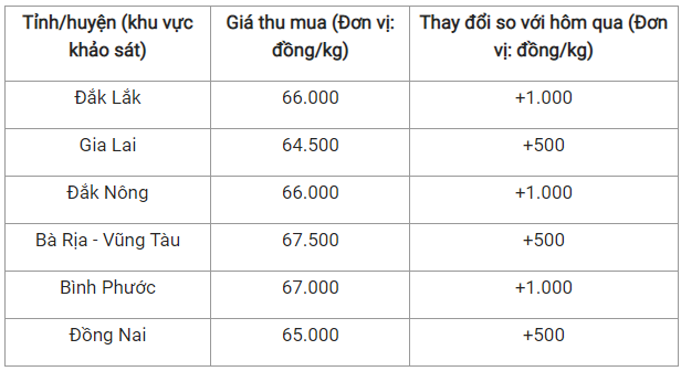 Kế đến là Đắk Lắk và Đắk Nông với chung mức giá thu mua 66.000 đồng/kg, cùng tăng 1.000 đồng/kg.