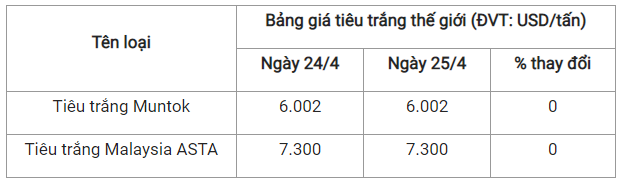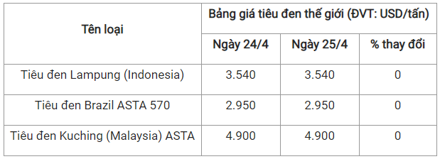 Theo cập nhật từ Hiệp hội Hồ tiêu Quốc tế (IPC) ngày 25/4 (theo giờ địa phương), giá tiêu thế giới so với ngày 24/4 như sau:
