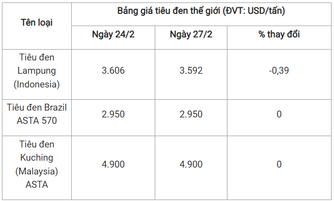 Theo cập nhật từ Hiệp hội Hồ tiêu Quốc tế (IPC) ngày 27/2 (theo giờ địa phương), giá tiêu thế giới so với ngày 24/2 như sau:
