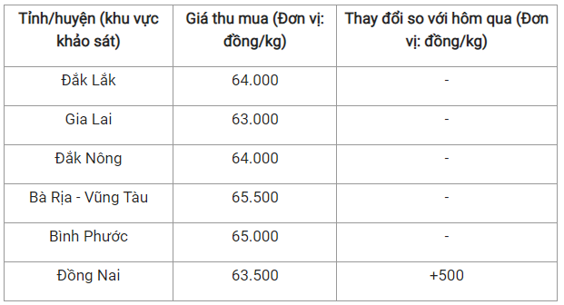 Ghi nhận cho thấy, mức giá thấp nhất hiện là 63.000 đồng/kg tại tỉnh Gia Lai.