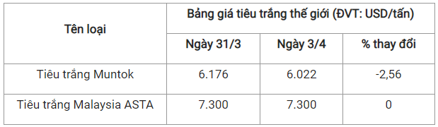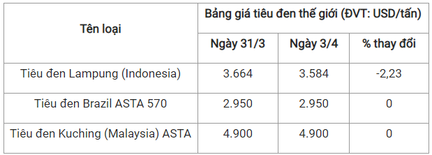 Theo cập nhật từ Hiệp hội Hồ tiêu Quốc tế (IPC) ngày 3/4 (theo giờ địa phương), giá tiêu thế giới so với ngày 31/3 như sau: