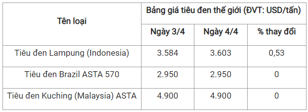 Theo cập nhật từ Hiệp hội Hồ tiêu Quốc tế (IPC) ngày 4/4 (theo giờ địa phương), giá tiêu thế giới so với ngày 3/4 như sau: