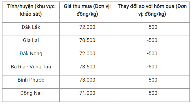Hiện tại, mức giá thấp nhất được ghi nhận là 70.500 đồng/kg tại Gia Lai và Đồng Nai có mức giá cao hơn một chút là 71.000 đồng/kg.
