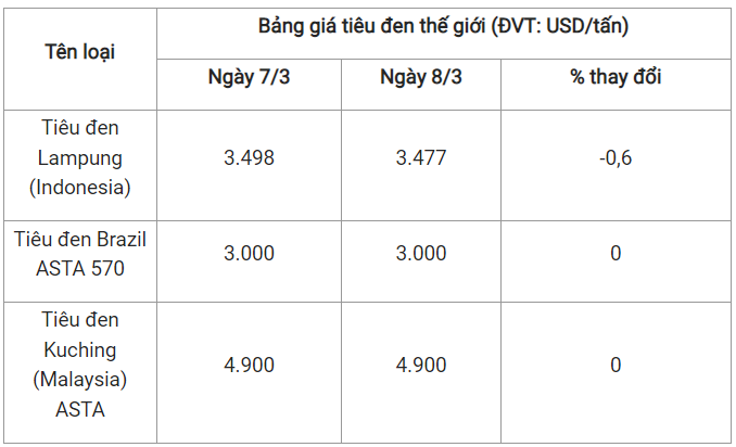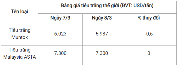 Theo cập nhật từ Hiệp hội Hồ tiêu Quốc tế (IPC) ngày 8/3 (theo giờ địa phương), giá tiêu thế giới so với ngày 7/3 như sau: