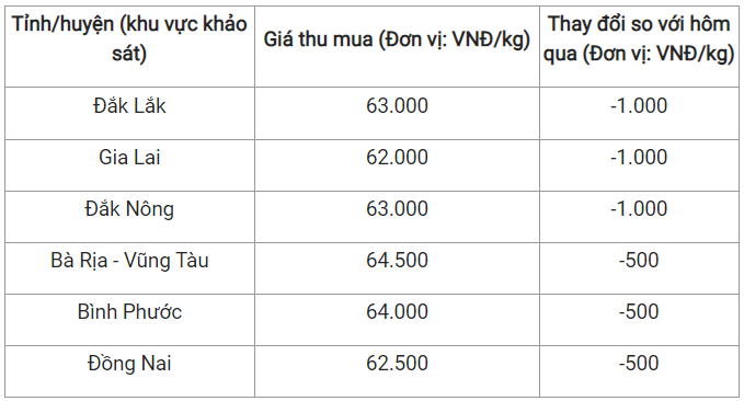 Cụ thể, tỉnh Gia Lai giảm 1.000 đồng/kg xuống mức thấp nhất là 62.000 đồng/kg. Tiếp đó, Đồng Nai giảm 500 đồng/kg, hiện ghi nhận mức 62.500 đồng/kg.