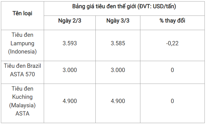 Theo cập nhật từ Hiệp hội Hồ tiêu Quốc tế (IPC) ngày 3/3 (theo giờ địa phương), giá tiêu thế giới so với ngày 2/3 như sau:
