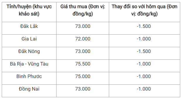 Tiếp đến là ba tỉnh Đồng Nai, Đắk Lắk và Đắk Nông với cùng mức thu mua 73.000 đồng/kg. Trong đó, giá tiêu tại Đồng Nai giảm 1.000 đồng và hai tỉnh Đắk Lắk và Đắk Nông giảm 1.500 đồng.