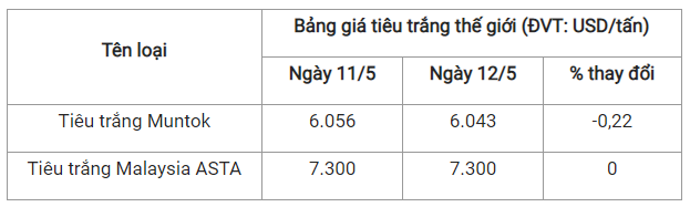 Theo cập nhật từ Hiệp hội Hồ tiêu Quốc tế (IPC) ngày 12/5 (theo giờ địa phương), giá tiêu thế giới so với ngày 11/5 như sau: