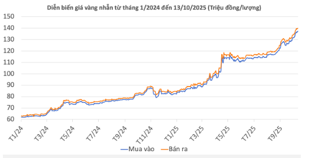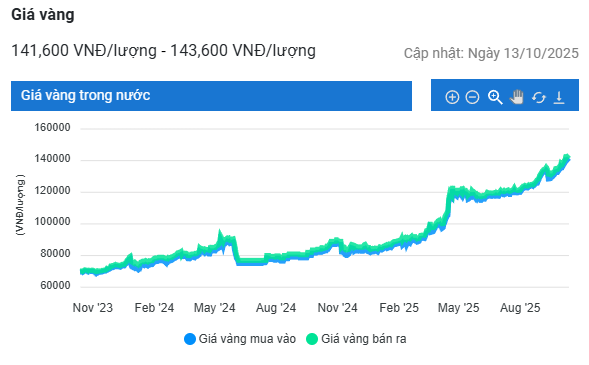 Theo đó, giá vàng hôm nay được mua vào ở 140,8 - 141,6 triệu đồng/lượng và bán ra ở 143,6 triệu đồng/lượng.