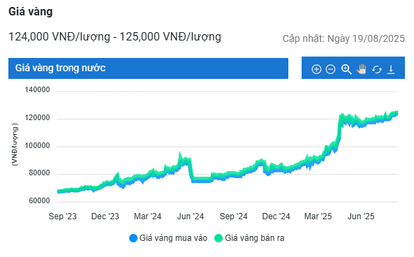 Theo đó, giá vàng hôm nay tăng lên mức đỉnh mới, 123 - 124 triệu đồng ở chiều mua vào và 125 triệu đồng ở chiều bán ra.