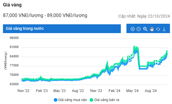 Hiện tại, giá vàng miếng SJC được mua vào ở 87 triệu đồng/lượng và bán ra ở 89 triệu đồng/lượng.