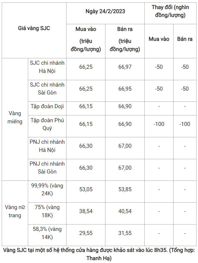 Giá vàng trong nước hôm nay (24/2) ghi nhận mức giảm không quá 100.000 đồng/lượng tại một số cửa hàng kinh doanh.