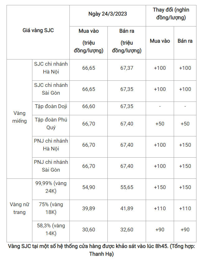 Giá vàng trong nước hôm nay (24/3) tăng không quá 150.000 đồng/lượng tại các cửa hàng kinh doanh.