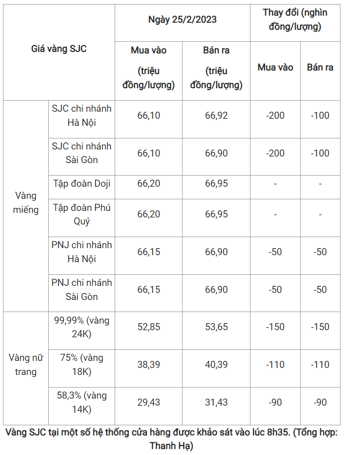 Giá vàng trong nước hôm nay ngày 25/2 giảm không quá 200.000 đồng/lượng tại các cửa hàng kinh doanh được khảo sát vào lúc 8h35.