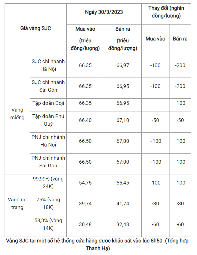 Theo đó, tại Công ty Vàng bạc Đá quý Sài Gòn, giá mua giảm 100.000 đồng/lượng và giá bán giảm 200.000 đồng/lượng.