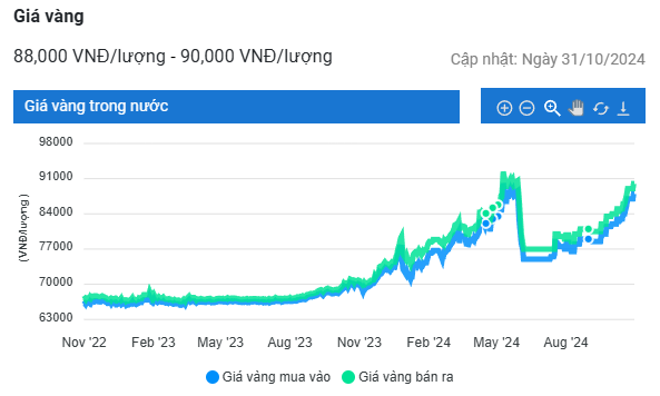Trên thị trường nội địa, giá vàng hôm nay tăng mạnh trong bối cảnh giá vàng thế giới đạt kỷ lục mới trong phiên giao dịch ngày 30/10 do sự không chắc chắn về cuộc bầu cử tổng thống Mỹ đã thúc đẩy nhu cầu trú ẩn an toàn.